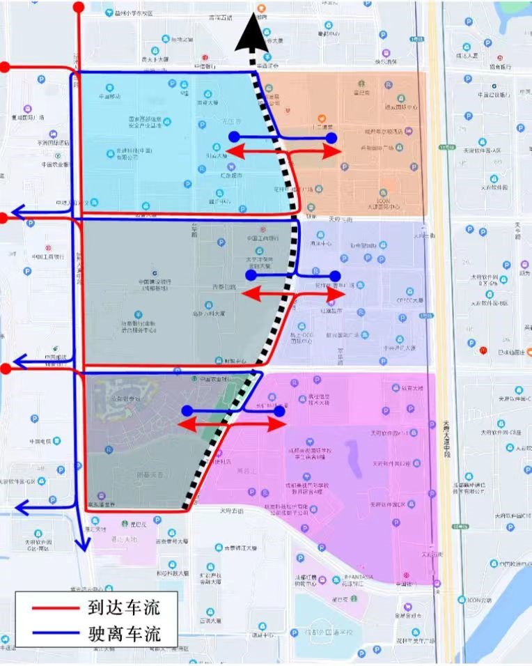 (三)天府三街(天府大道至吉泰路)实施潮汐交通组织:工作日07:00-10:00实施机动车由东向西单向行驶,17:00-19:00实施机动车由西向东单向行驶,其他时段恢复双向行驶。